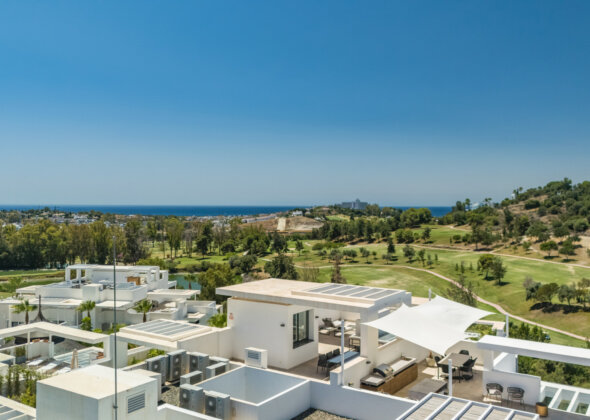 A beautifully presented 2-bedroom penthouse in excellent condition, offering spectacular panoramic sea and golf views and a privileged south‑west orientation. Flooded with natural light, the home features an elegant open‑plan living area with a fully fitted ...