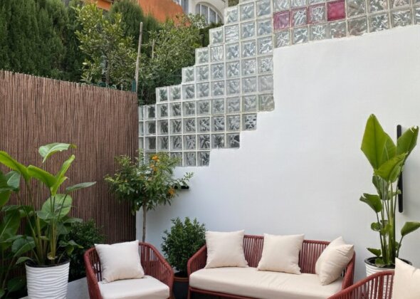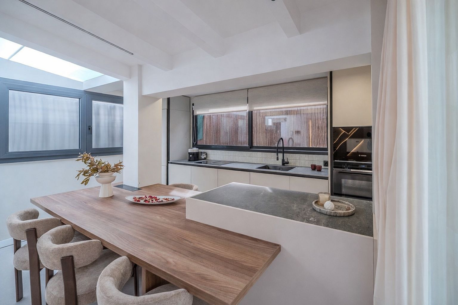Recently refurbished to a high standard, the interior combines contemporary style with practicality. The open-plan living and dining area flows into a fully fitted kitchen equipped with quality Bosch appliances. A cosy fireplace adds warmth in cooler months, while air conditioning ensures year-round comfort.