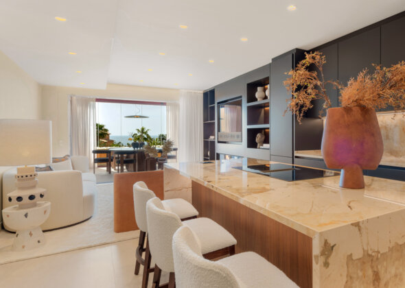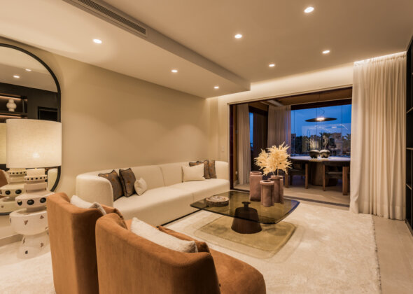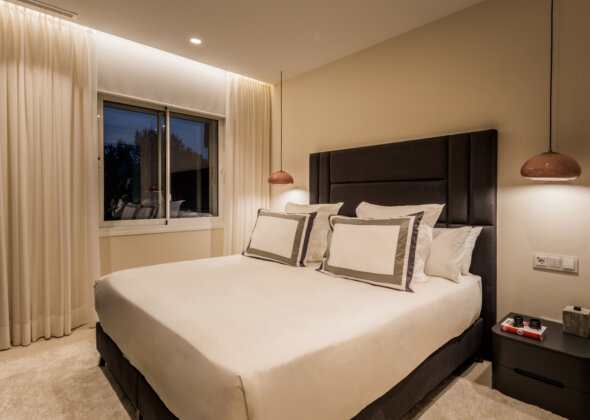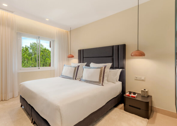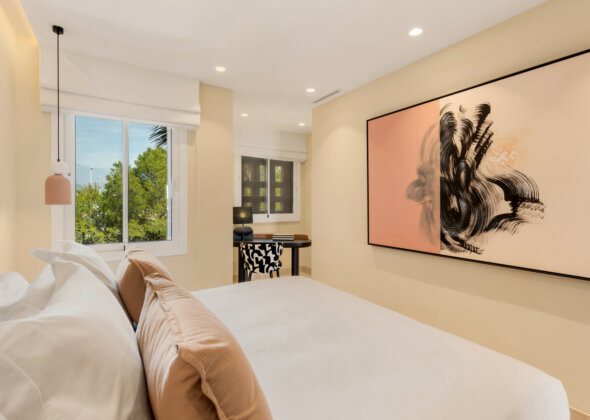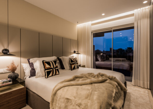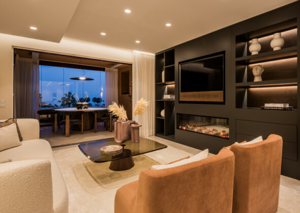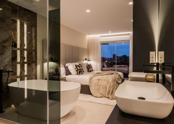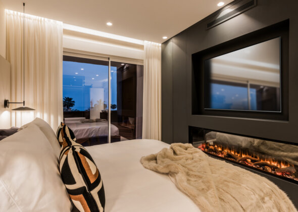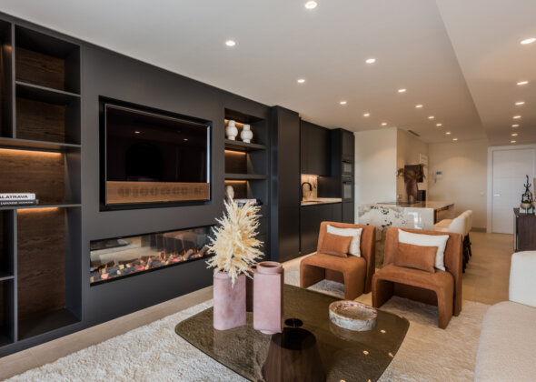 Inside, the apartment feels spacious and bright thanks to its open-plan layout and large glass doors. The living room is cosy with a fireplace for cooler evenings, and the kitchen is modern and fully equipped for any cooking needs. There are three comfortable bedrooms, two of which have their own en-suite bathrooms, plus a guest toilet and a guest room for visitors. The home also comes with underfloor heating, air conditioning, smart home features, electric blinds, and double glazing, so it’s comfortable all year round. There’s plenty of storage, a laundry room, fitted wardrobes, and even a private garage.
