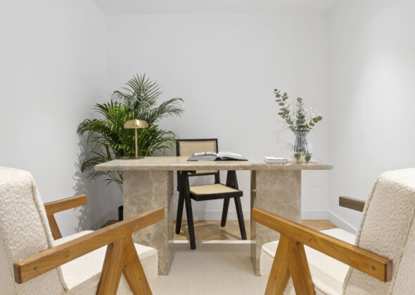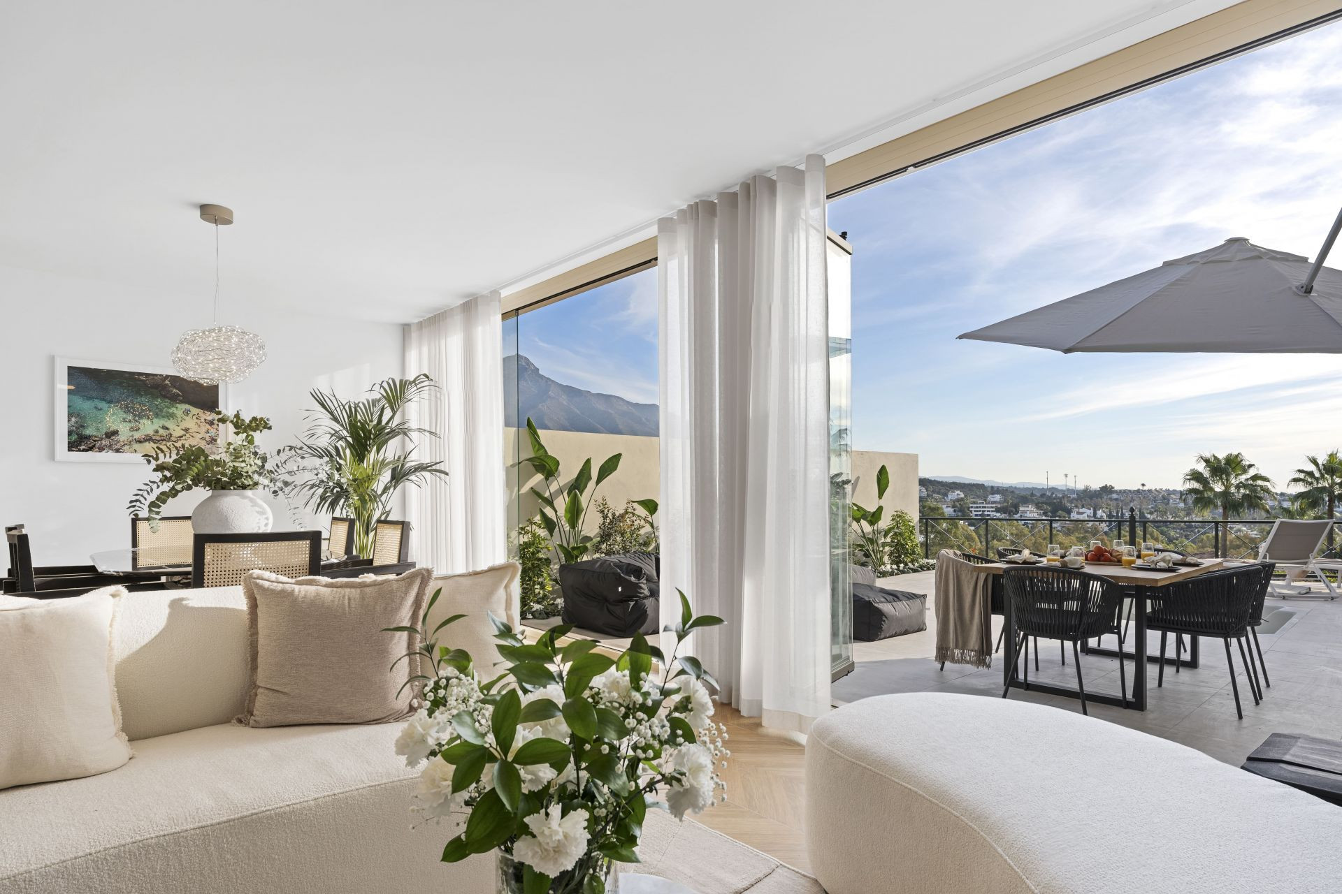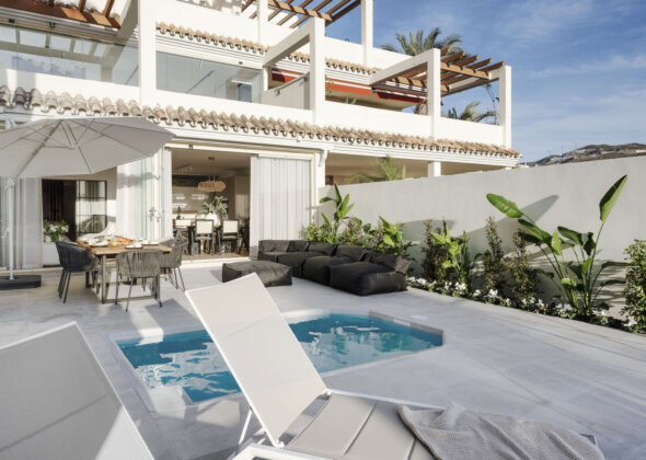 This property presents a luxurious four-bedroom apartment with a private pool and garden, offering stunning sea and mountain views. This renovated ground-floor apartment is a haven of modern, Parisian style living in the heart of Nueva Andalucia, La Cerquilla.