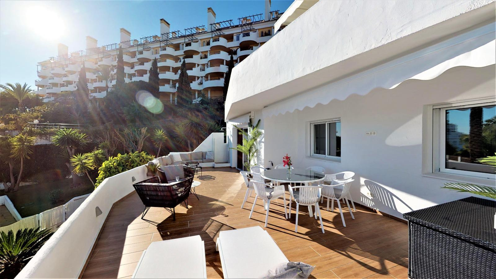 The property features a spacious 47 m² terrace with pleasant views of the urban surroundings, including a glimpse of the iconic La Concha mountain. Renovated to a high standard, the apartment comprises three bedrooms, two modern bathrooms, and a generous terrace equipped with an outdoor shower and barbecue area—ideal for entertaining.