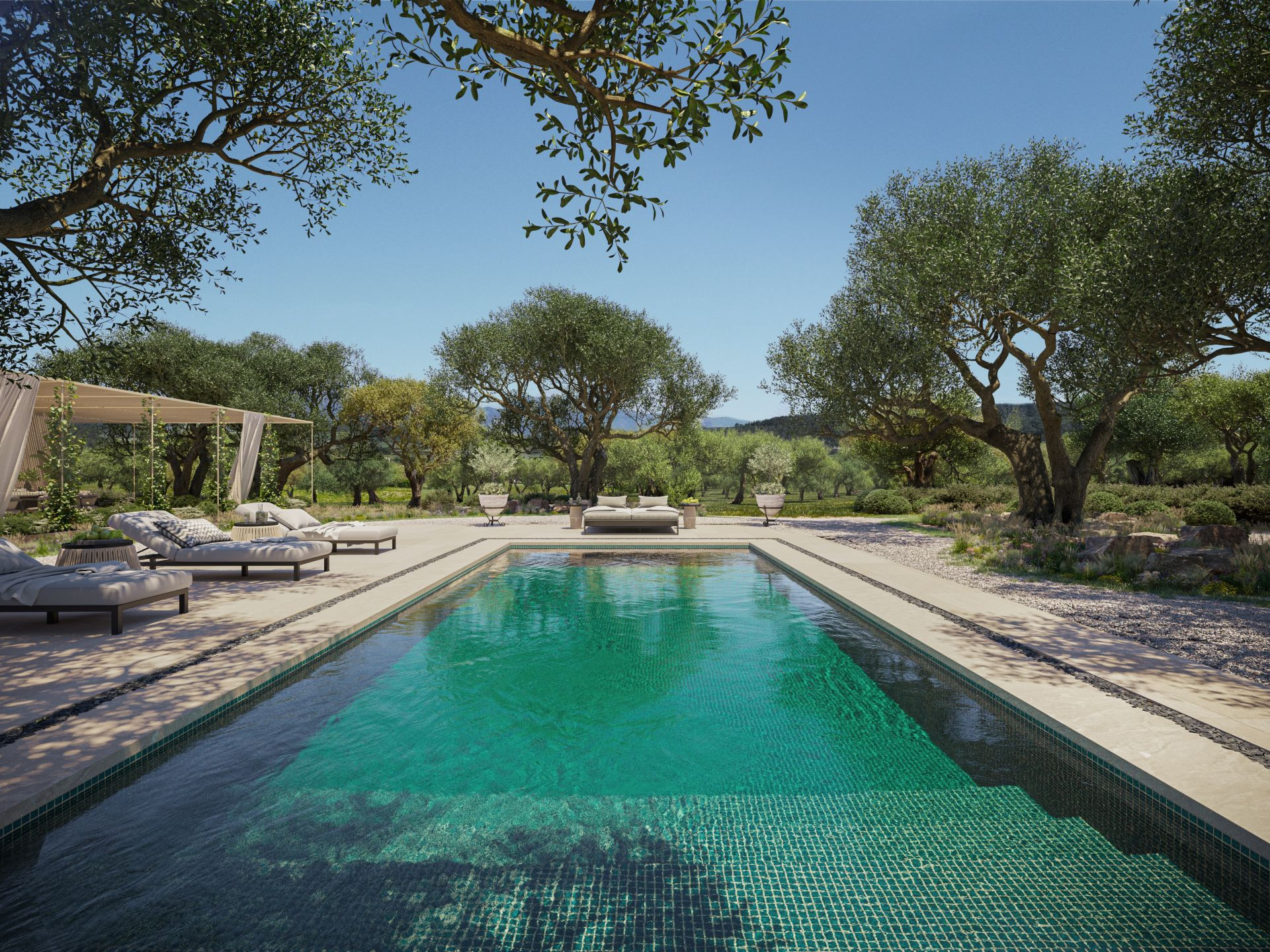 The estate features four distinct villas, an ancient stone mill transformed into a floating yoga platform, and additional outbuildings, altogether offering 14 en-suite bedrooms harmoniously integrated with natural stone and terracotta materials.