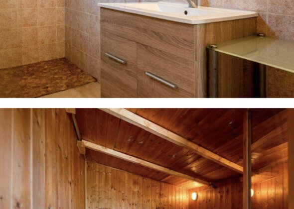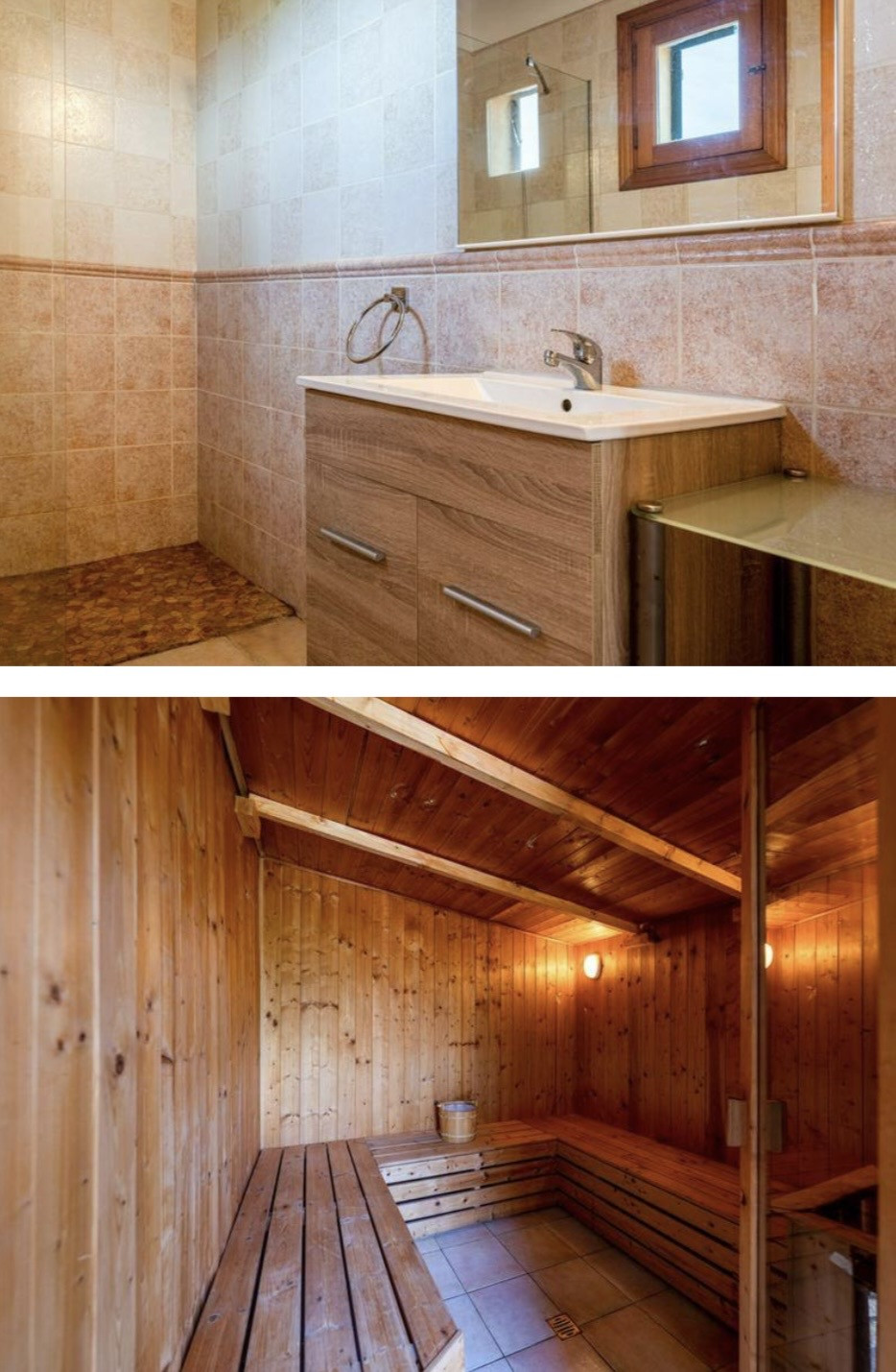 Outdoors, the property feels like a boutique resort: a large swimming pool, sun-soaked terraces, a fully equipped summer kitchen with barbecue and wood-fired oven, a hot tub, and a sauna — creating a year-round wellness and entertainment environment.