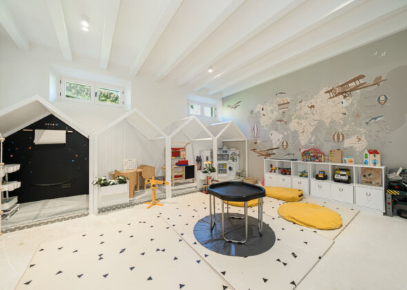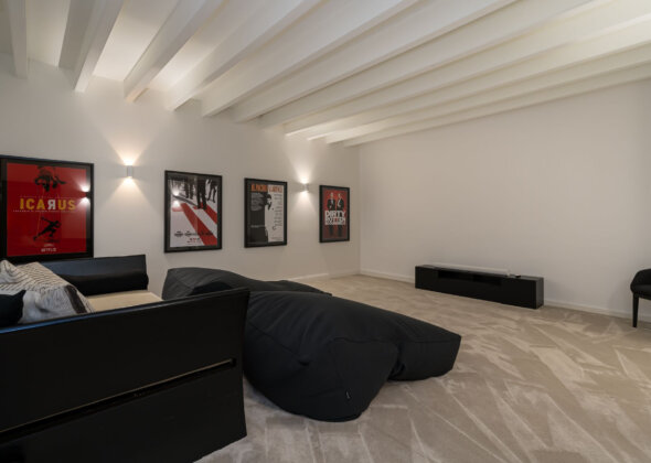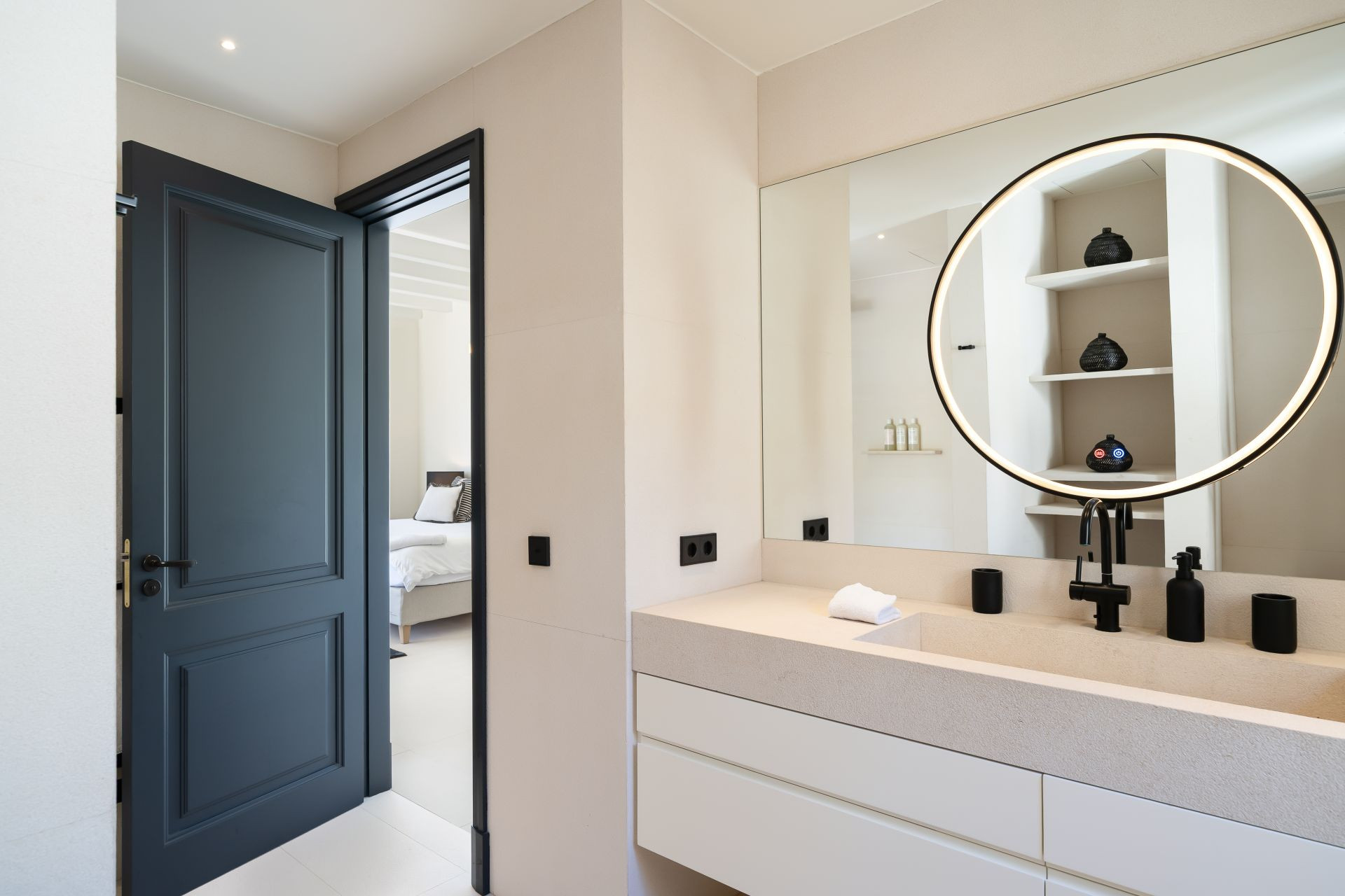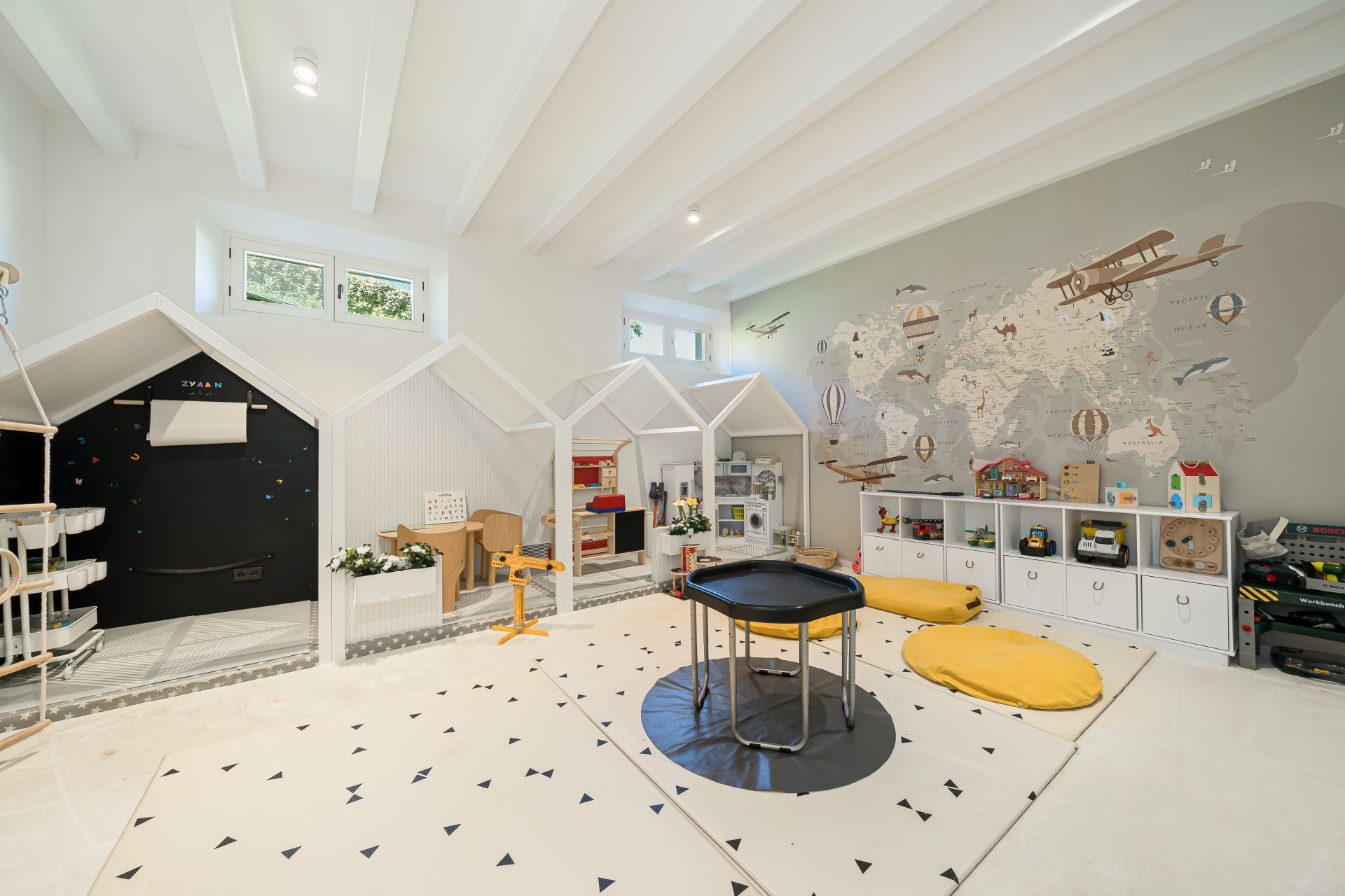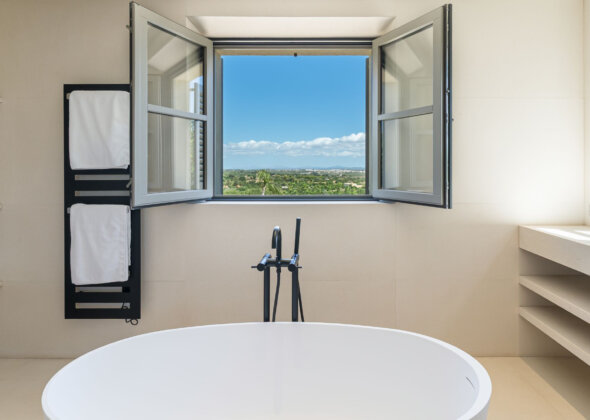Inside, light floods through floor-to-ceiling windows, highlighting generous spaces and carefully chosen details. Five bedrooms, each with its own en-suite, ensure privacy and comfort, while seven bathrooms and two guest toilets make the home practical for family and guests. Delivered fully furnished with bespoke pieces, the villa is ready to be lived in from the first day.