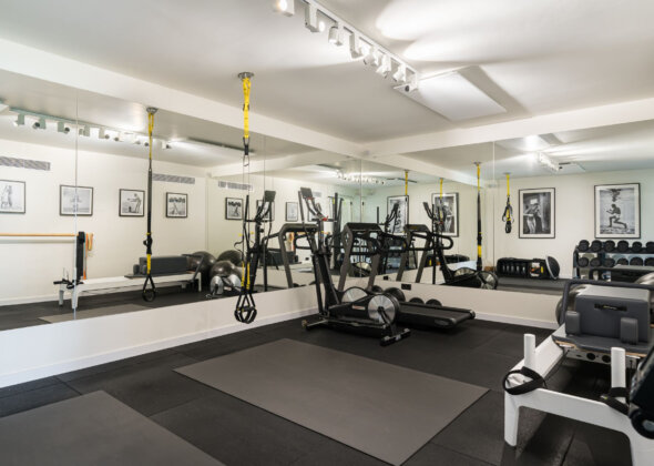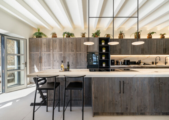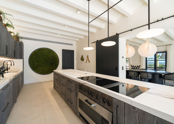 Life here is about more than architecture. A heated pool framed by citrus trees, landscaped gardens, and shaded terraces invite year-round outdoor living. Wellness is built in, with a gym, sauna, and cinema room, while a temperature-controlled wine cellar adds a touch of indulgence. The kitchen, fitted with Gaggenau appliances, is designed for those who love to cook and entertain, flowing easily into dining and living areas that blur the line between indoors and out.