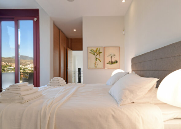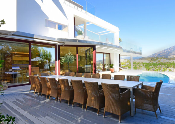 The state-of-the-art Poggenpohl kitchen is designed for gourmet dining, seating 16 guests, with a secondary kitchen and laundry room for added convenience. Upstairs, two luxurious master suites feature en-suite bathrooms and direct access to a bar and lounge with panoramic valley and sea views. The ground floor offers five spacious bedrooms with six king-size beds, four en-suite bathrooms, and direct access to the terrace and pool area.