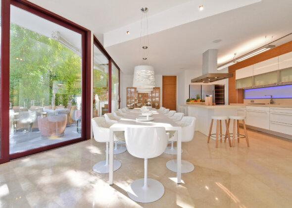 This newly renovated villa is built to the highest standards, offering breathtaking views of the Golf Course and a stunning Scandinavian-style infinity pool with a Jacuzzi. Floor-to-ceiling windows flood the open-plan living space with natural light, seamlessly blending indoor and outdoor elegance.