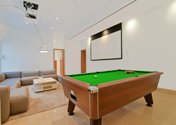 Designed for both relaxation and entertainment, the villa boasts an outdoor gym, a high-end cinema room, and a sleek pool/snooker table. Cutting-edge features include LED lighting, a SONOS surround system, smart home technology, underfloor heating, and a modern kitchen with premium appliances, a wine cooler, ice machine, and a teppanyaki plate.