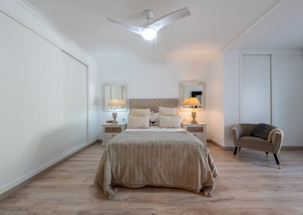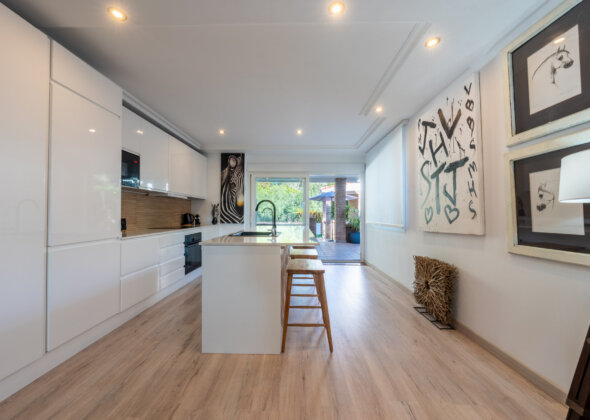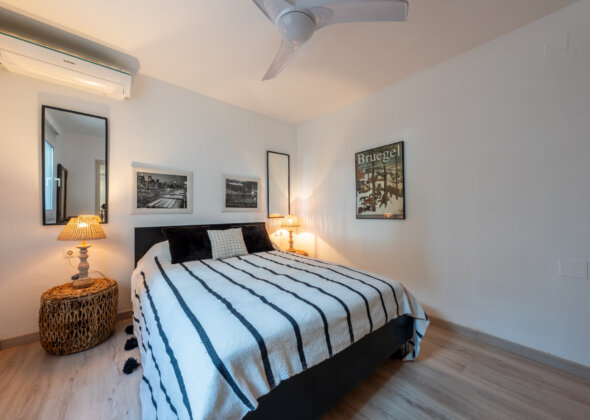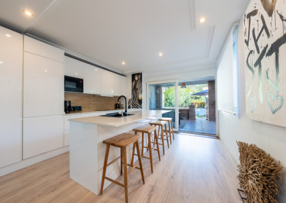 The open, functional kitchen complements the home’s style with clean lines and subtle earthy finishes, ideal for both everyday living and entertaining. All three bedrooms are generously sized, designed as serene retreats with layered textiles, natural woods, and a calm, airy feel. The bathrooms follow the same aesthetic, combining simplicity with character.