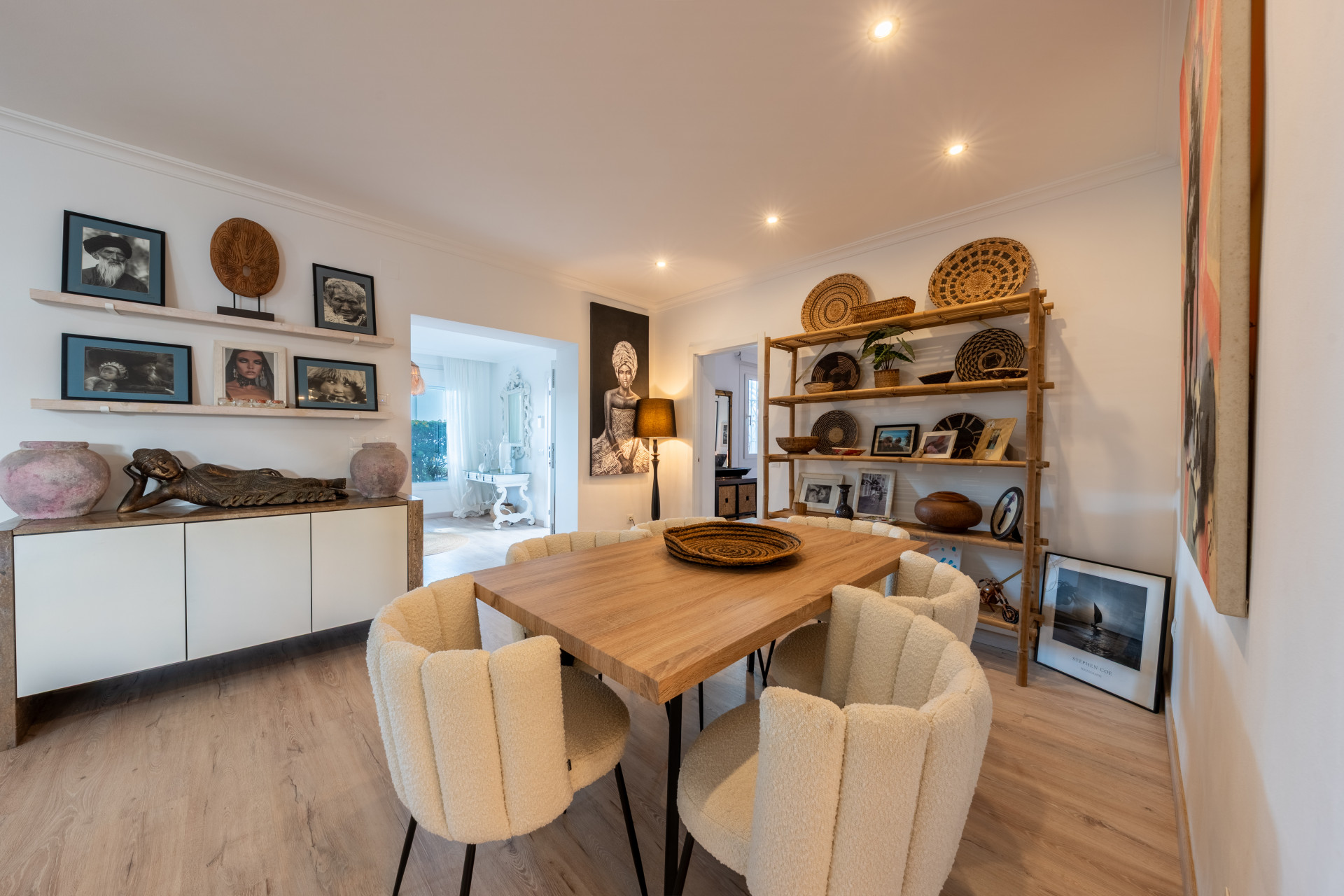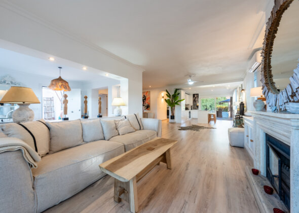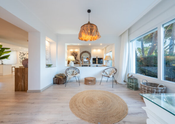 The house welcomes you with light-filled spaces, where natural textures, soft neutral tones, and artisanal details create a warm, effortless elegance. The living area flows seamlessly into the dining space, styled with organic materials, woven accents, and carefully curated décor that evokes a laid-back yet sophisticated coastal atmosphere.
