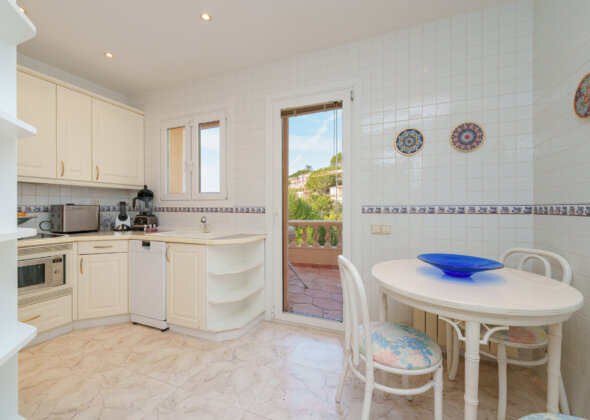 Additional conveniences include a utility room, storage spaces, built-in wardrobes, as well as a garage plus two exterior parking spaces, all secured with electric gates.