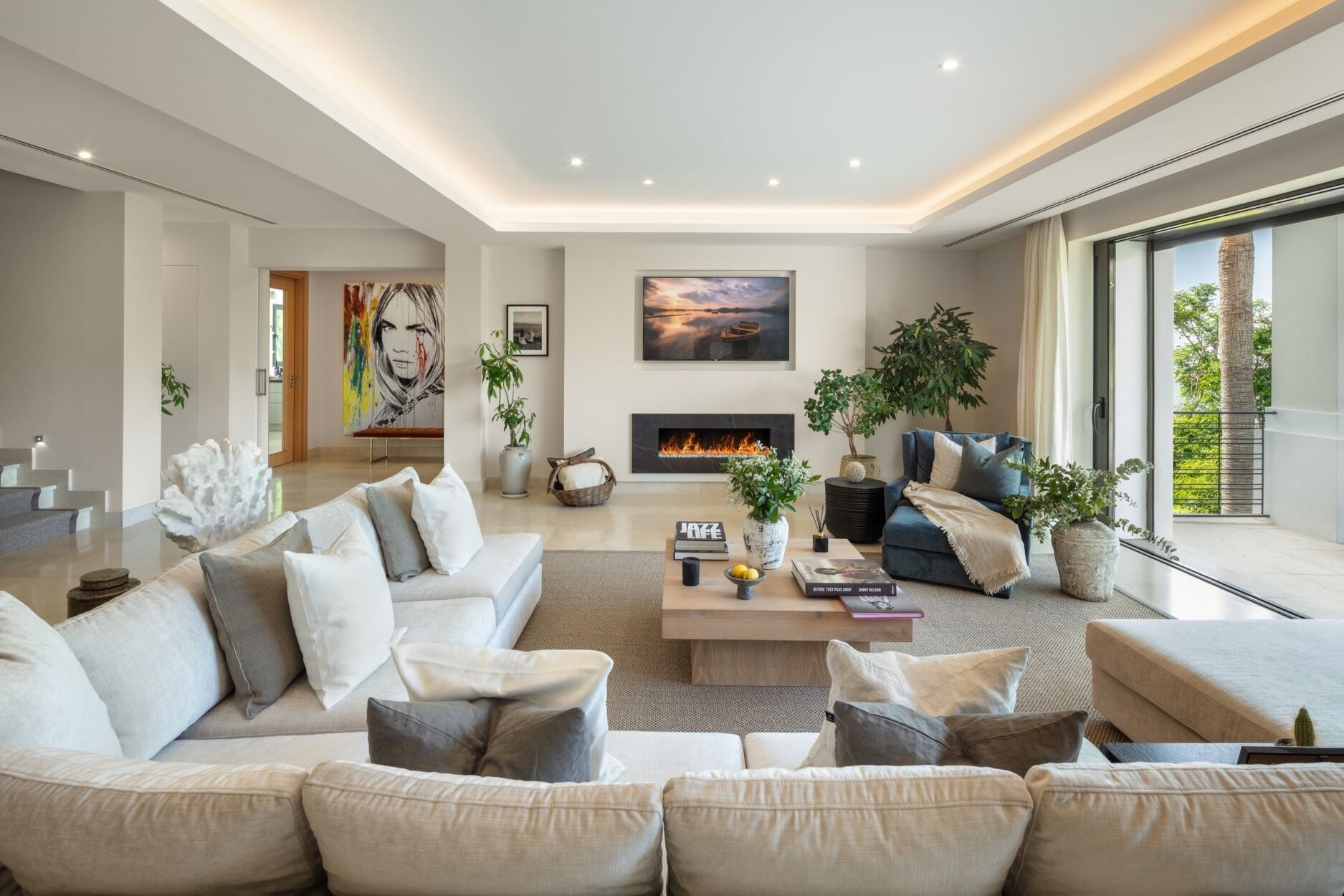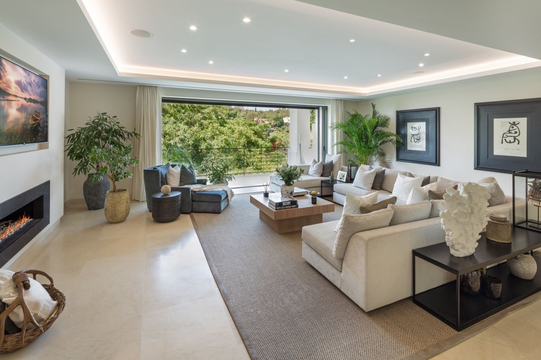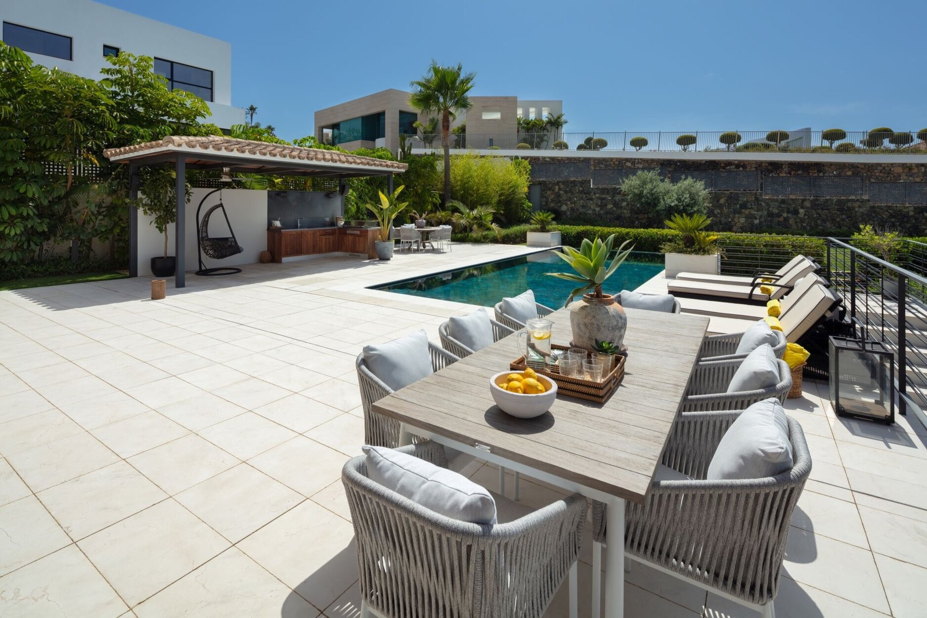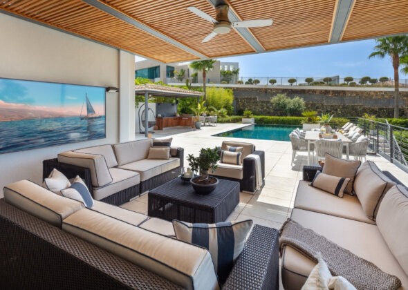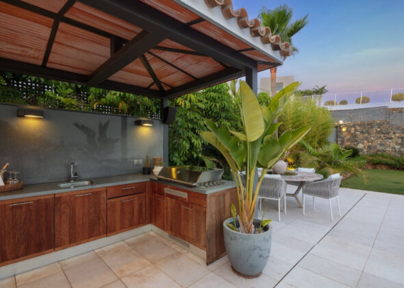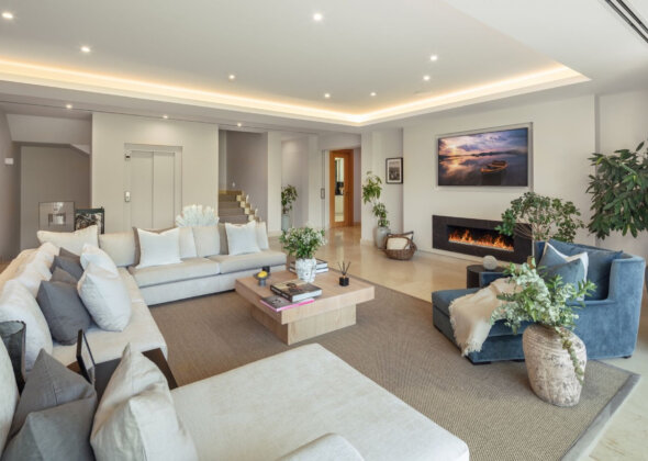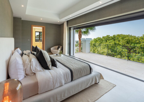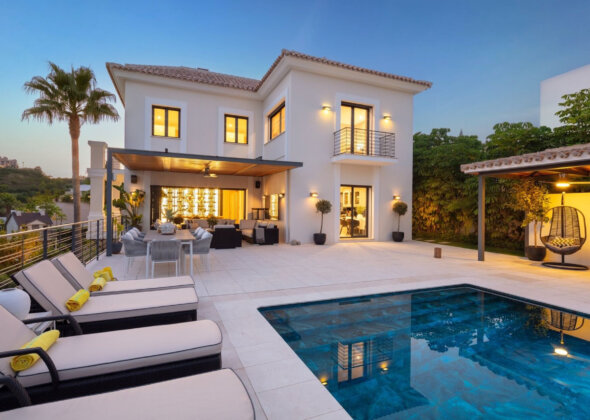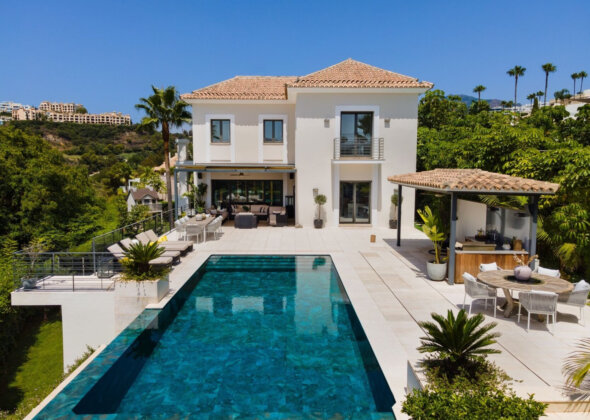 Spectacular villa nestled in the heart of El Herrojo, this contemporary 6 bedroom villa is surrounded by numerous golf courses, with panoramic views to Marbella’s coastline and within the immediate vicinity of Nueva Andalucía and Puerto Banús. Exquisitely renovated in a modern style, this 3 level estate is a paradise for family and friends and open to the light and the views only Southern Spain can offer. Built throughout three levels, the main floor comprises an expansive open plan area, complete with a stylish living and dining area with a beautiful custom designed bodega and an enormous fully fitted kitchen, which all lead effortlessly to the tropical outdoors. Exterior areas include luscious tropical gardens with a private swimming pool, outdoor kitchen and lounge areas, providing an oasis feeling. This quality modern home features 6 bedrooms, plus an extra space which has currently been converted into an office. The lower floor is dedicated to entertainment and relaxation including a play room, cinema room, gym and a garage that fits up to 4 cars.