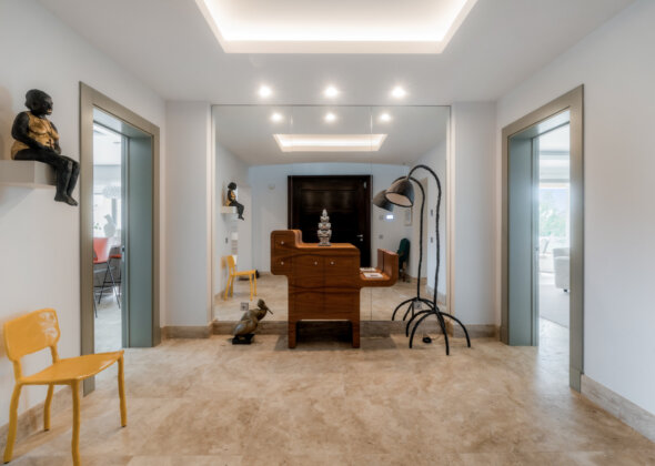 A breathtaking driveway leads to the grand entrance, setting the tone for the refined luxury within. The villa boasts five well-appointed bedrooms, each with en-suite bathrooms, and an additional guest bathroom. The interiors are thoughtfully designed with high-end finishes, expansive windows that bathe the spaces in natural light, and seamless indoor-outdoor transitions.