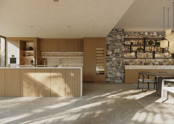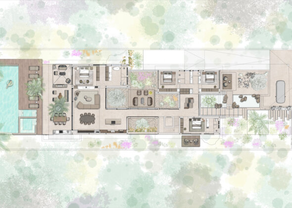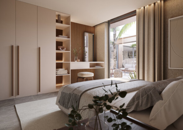 The villa features an elegant Mediterranean design, combining natural earthy tones, dark wood elements and refined stone finishes. Surrounded by lush gardens and a sheltered patio with soothing water features, the home provides a peaceful and inviting retreat.