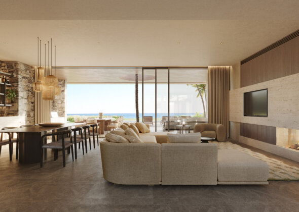 Inside, the open-concept layout offers bright and generous living spaces of around 460 m². Large glass doors connect the living, dining and kitchen areas seamlessly with expansive terraces, creating a smooth transition between indoor and outdoor living. Outside, an infinity pool, jacuzzi, sunset lounge, fire pit, outdoor kitchen and a spacious roof terrace with breathtaking sea views set the scene for unforgettable moments.