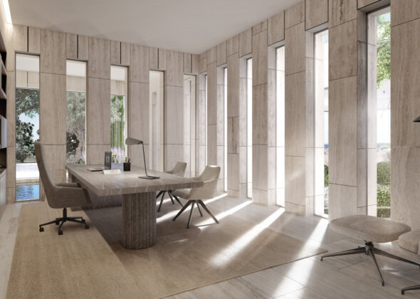 Leisure and wellness are at the heart of the home’s concept. It features both an outdoor infinity pool and an indoor heated pool, complemented by a fully equipped gym and spa area for relaxation and well-being. The residence also includes a wine cellar, perfect for entertaining guests or enjoying private tastings, as well as a dedicated home office that provides a serene environment for remote work or creative pursuits.
