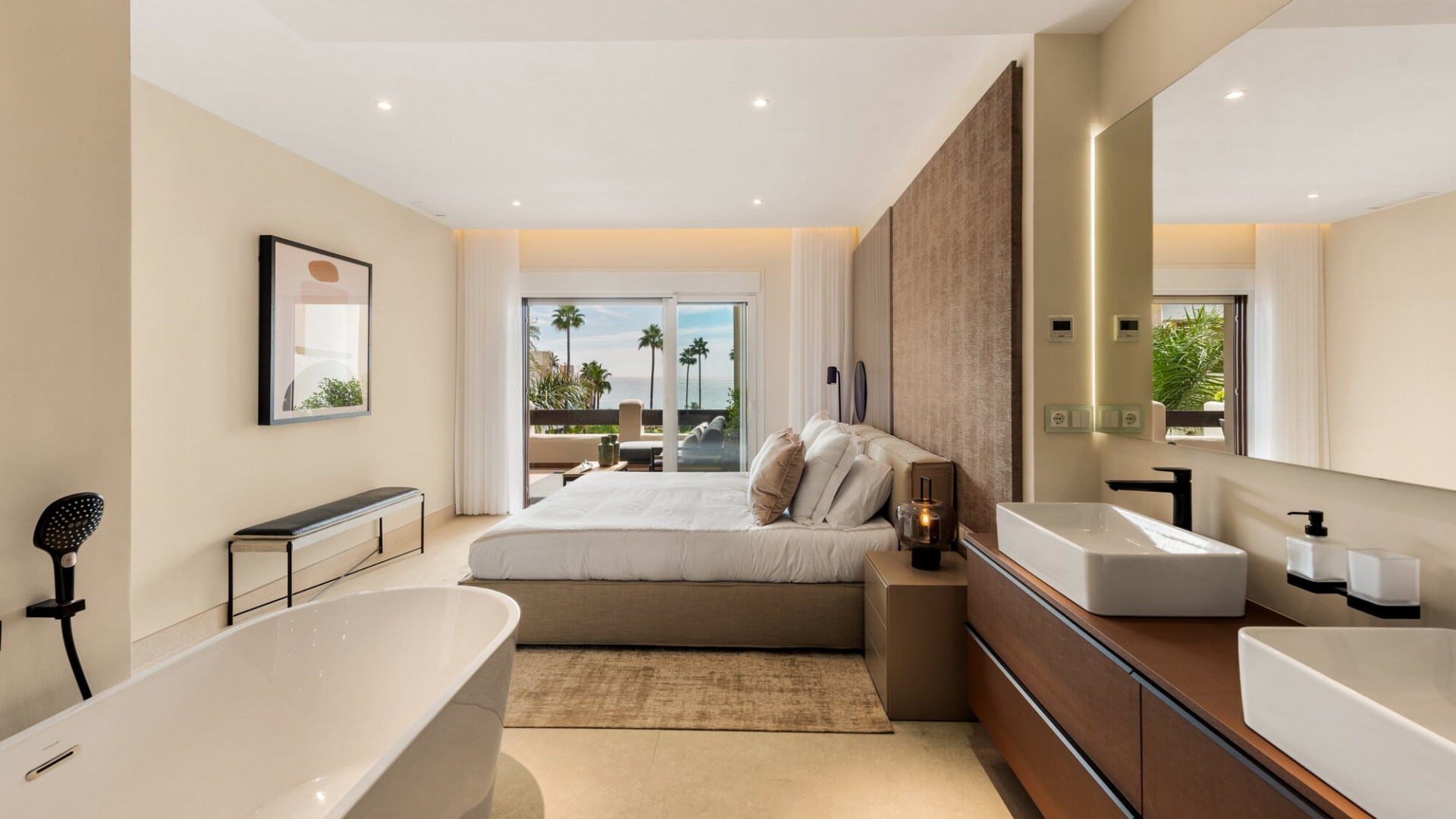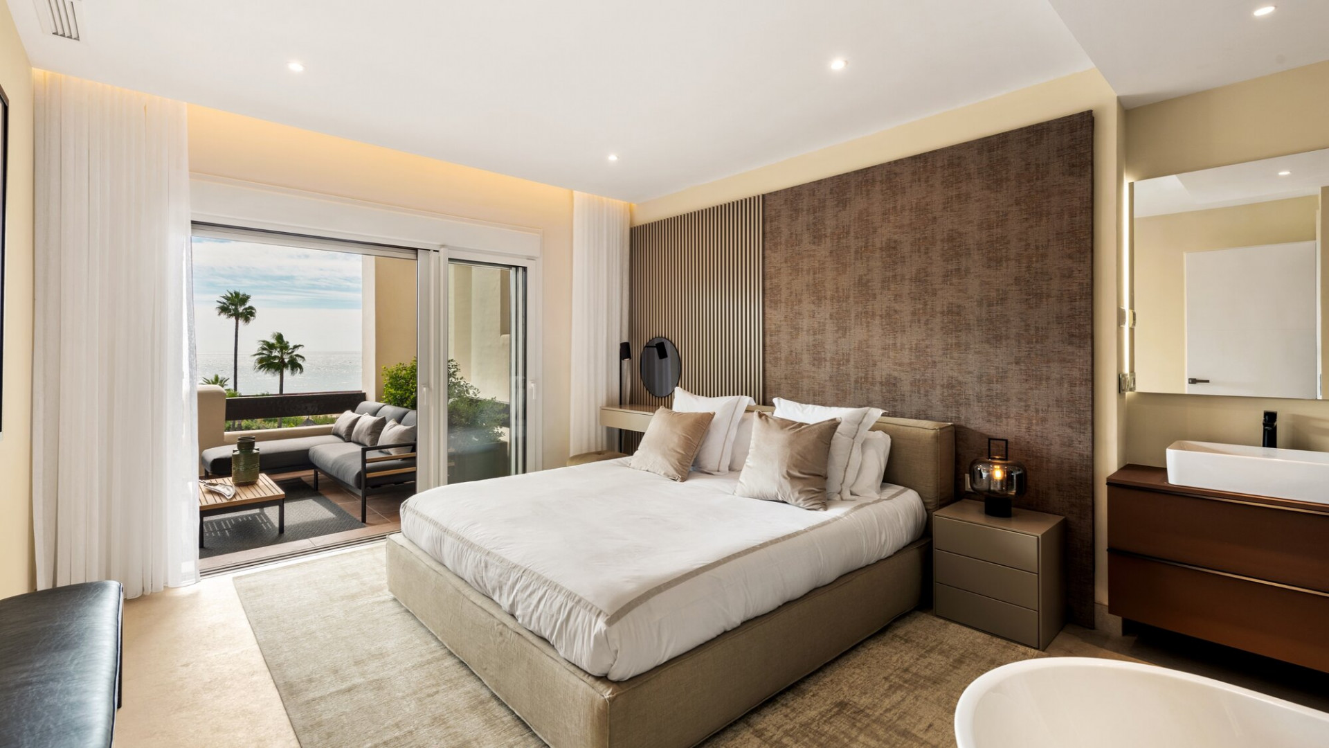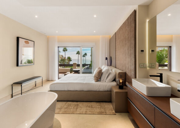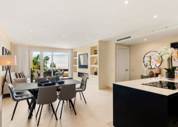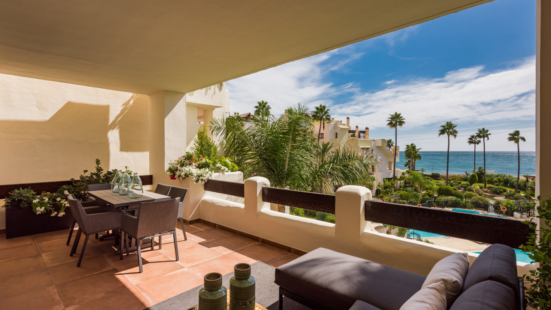 Fully renovated top quality 3-bedroom second floor apartment in Bahia del Velerin. Frontline beach, south – West facing, sea views, quiet and private. Direct access to the beach.