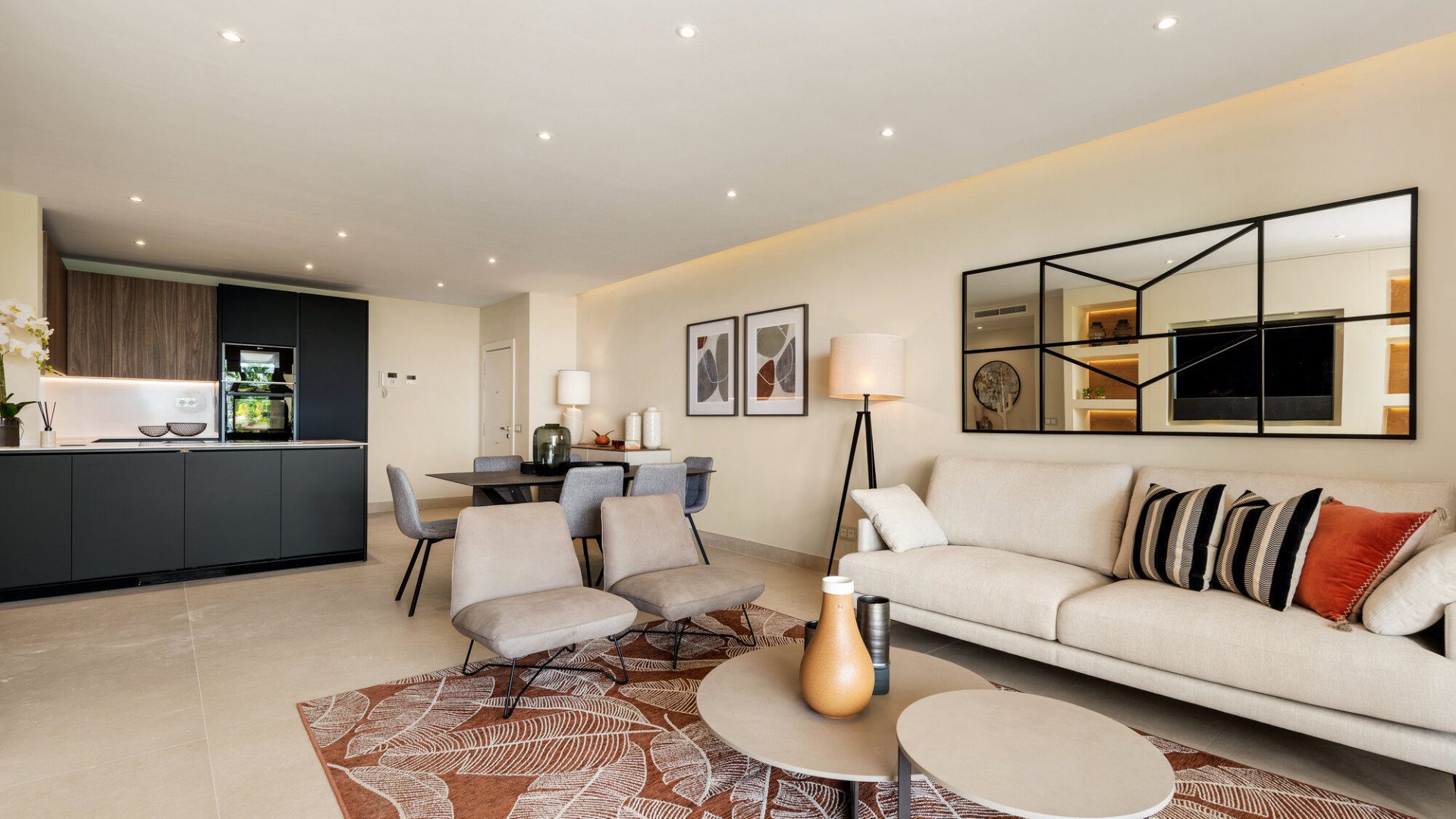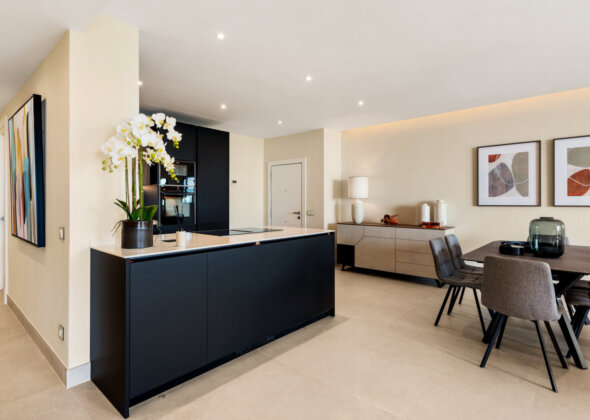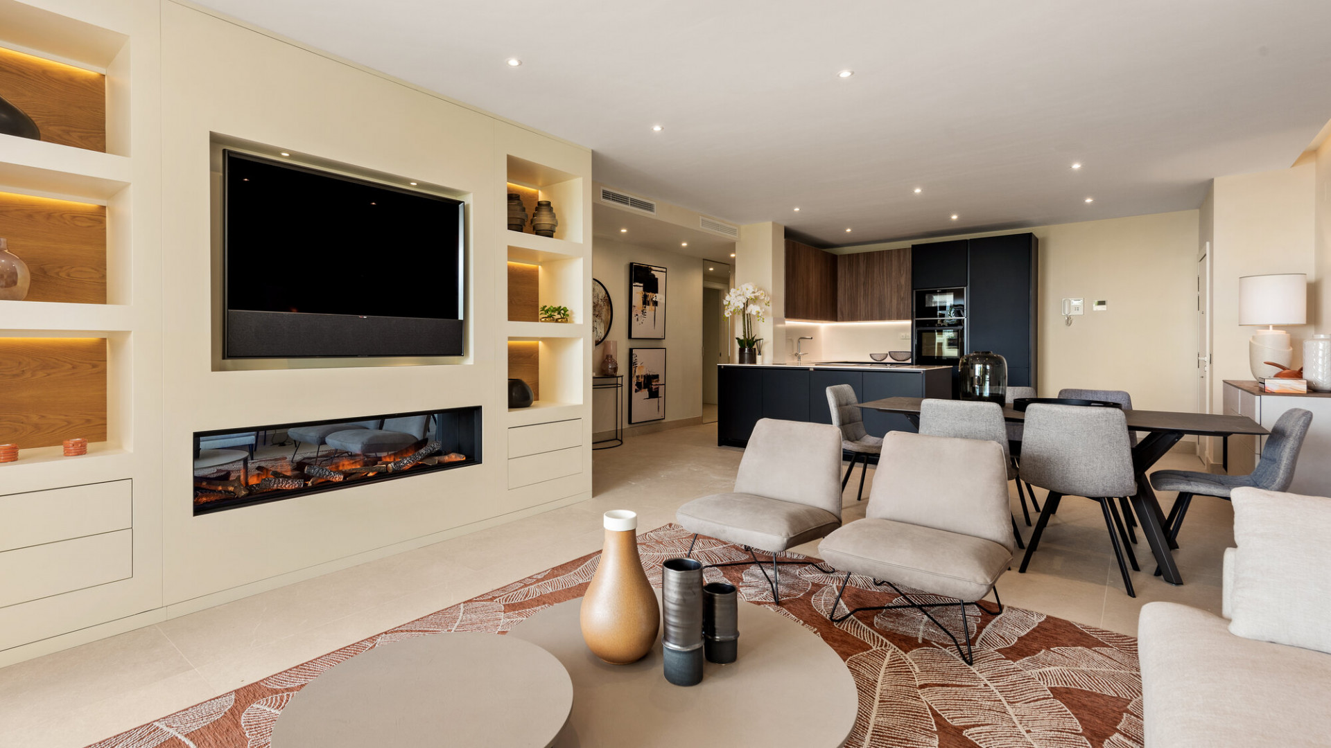 Spacious living and dining area with fully fitted open plan kitchen (Neff appliances). Master bedroom en suite, walking closet and two guest bedrooms sharing a bathroom. Underground parking and storage.