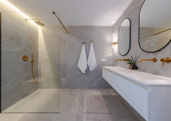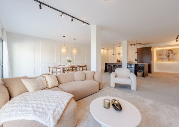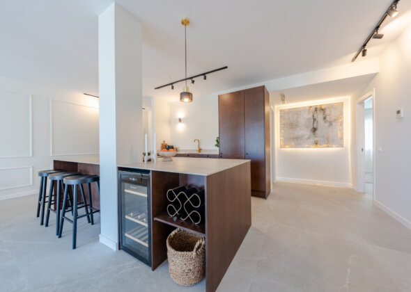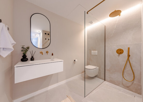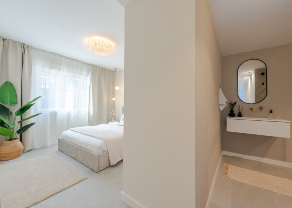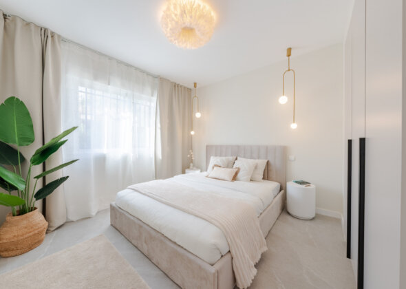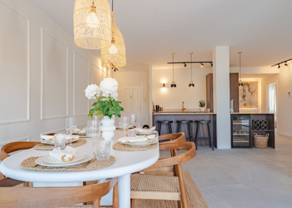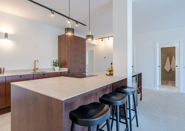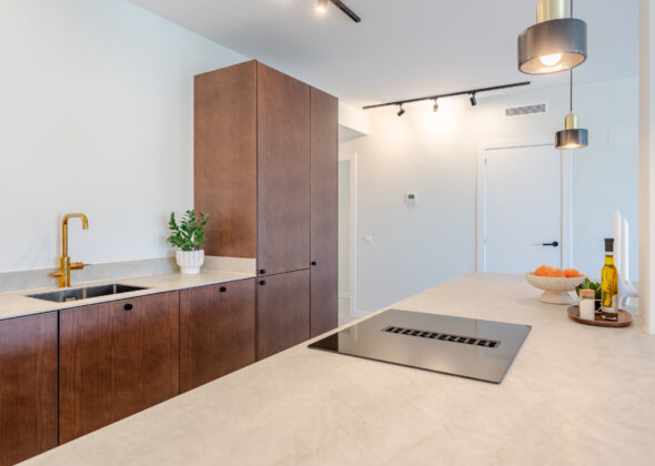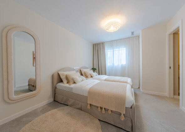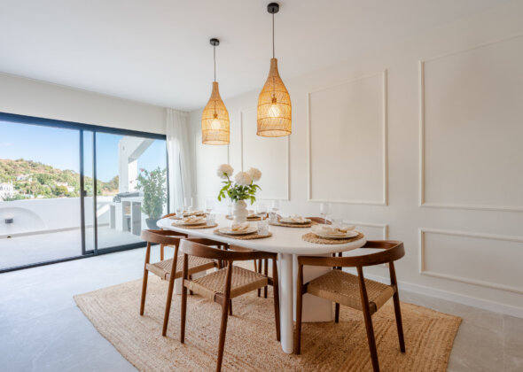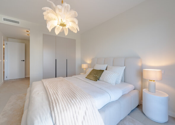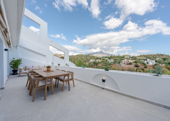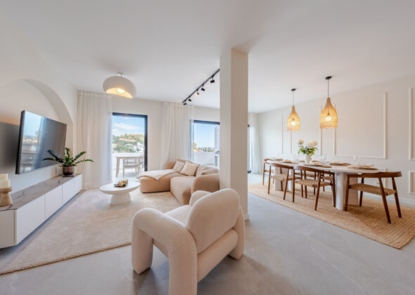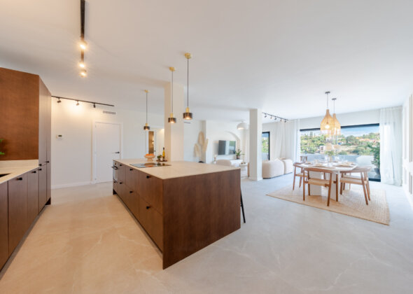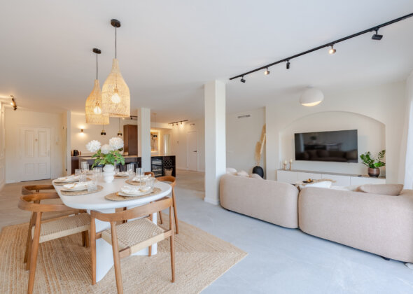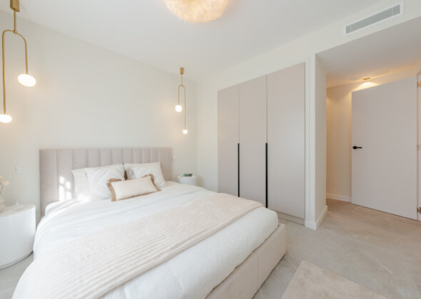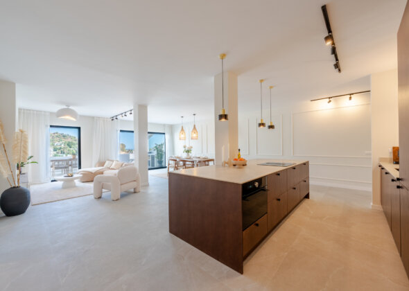 Mirador 5 offers modern design, generous space, and breathtaking views. The open-plan living area combines a bright lounge, dining space, and a fully equipped oak-panelled kitchen with a central island, leading onto a large terrace overlooking the golf course, La Concha mountain, and the sea.