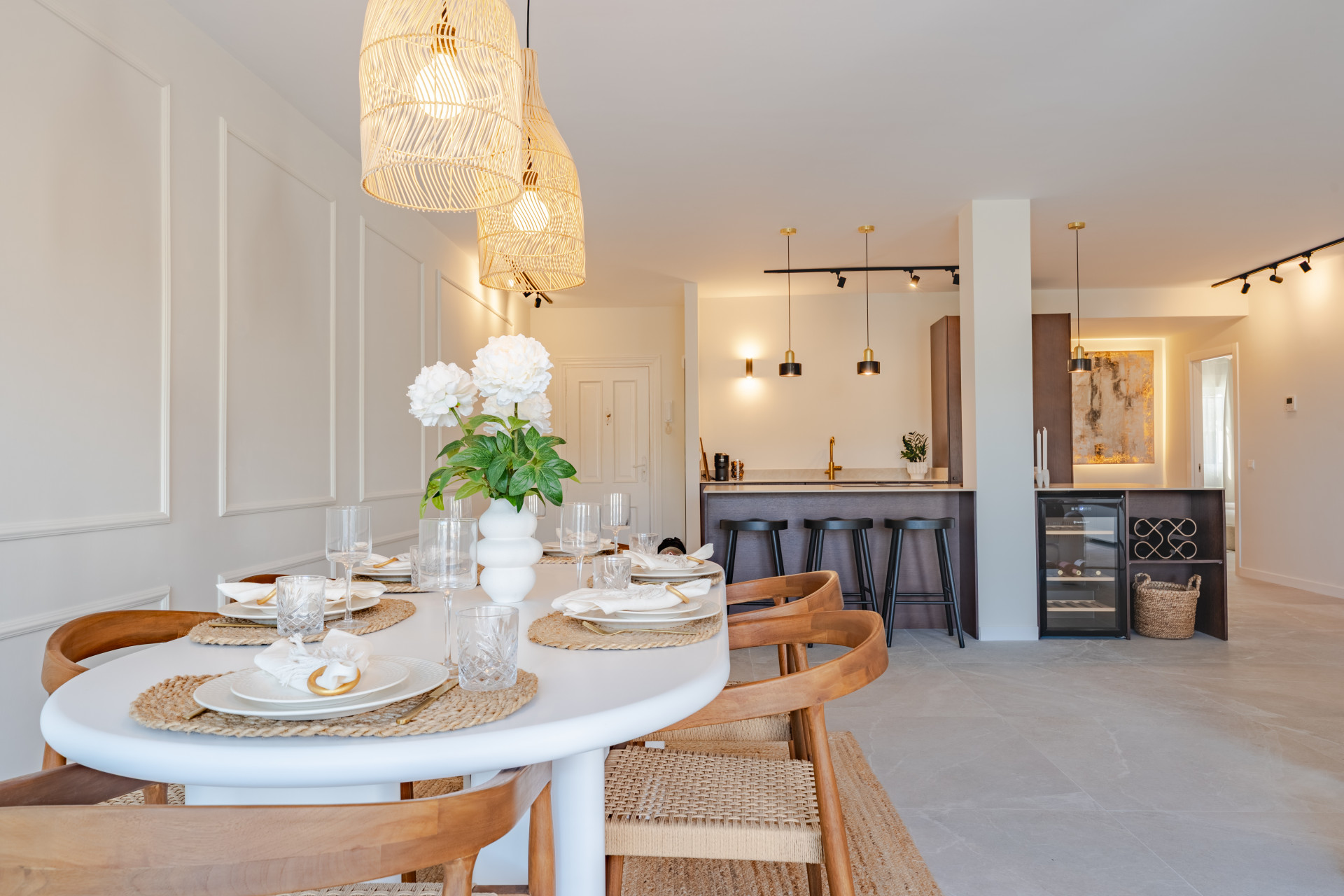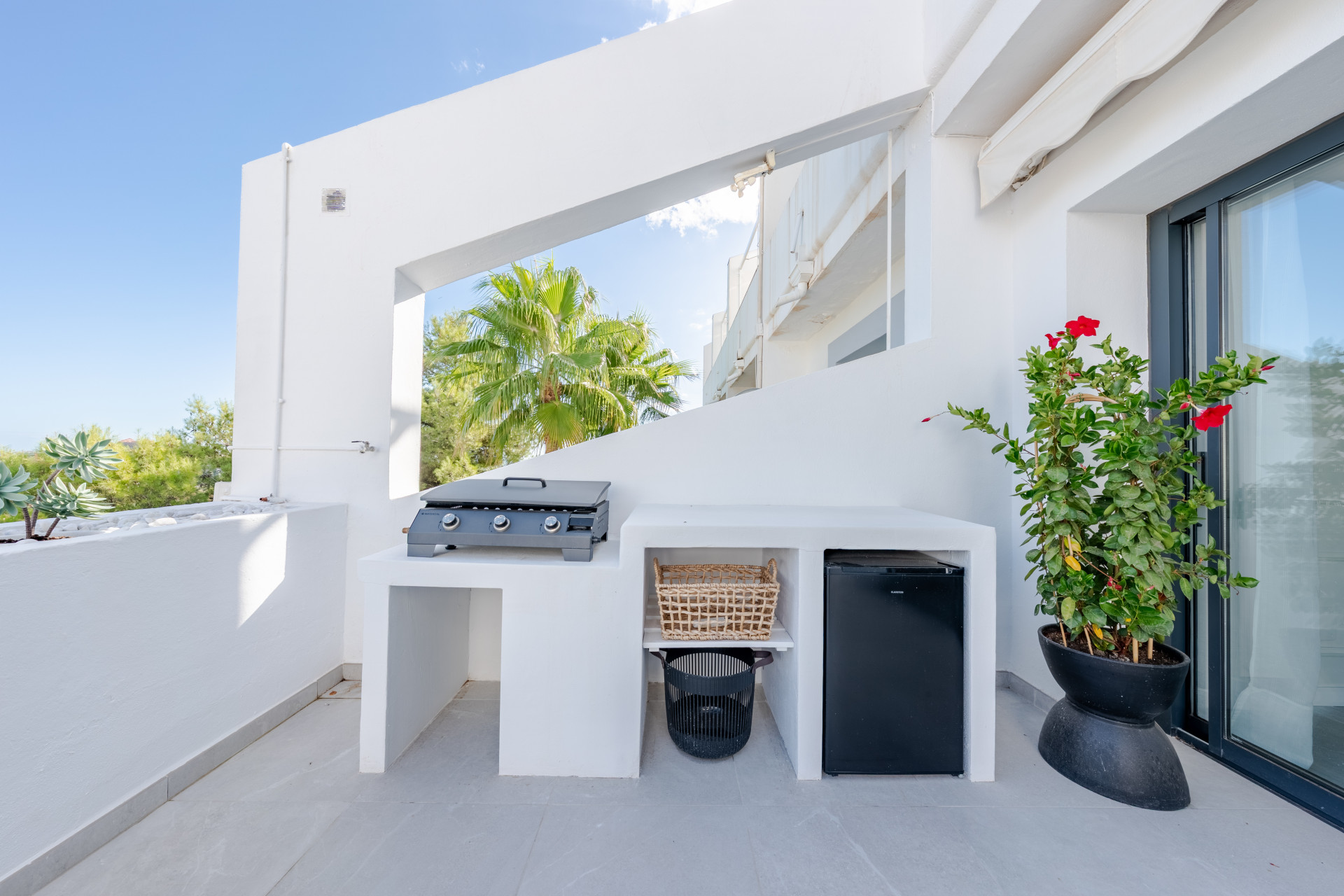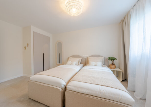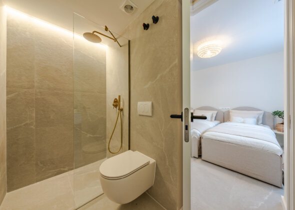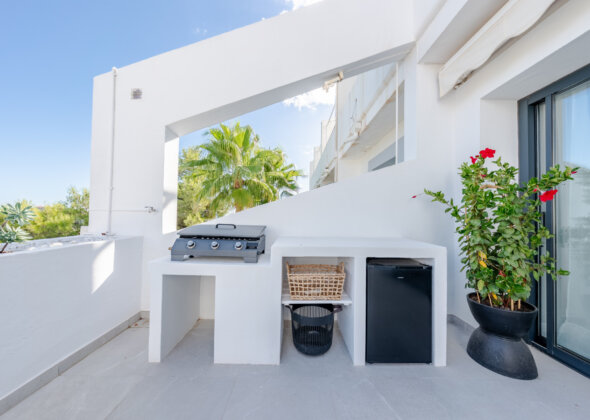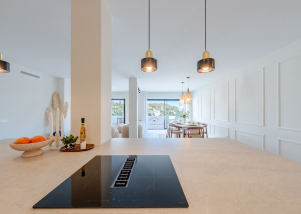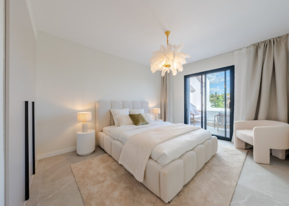 The master bedroom has direct terrace access and sea views, while both guest bedrooms feature en-suite bathrooms. Finishes are of the highest quality, including designer appliances, elegant flooring, and refined décor.