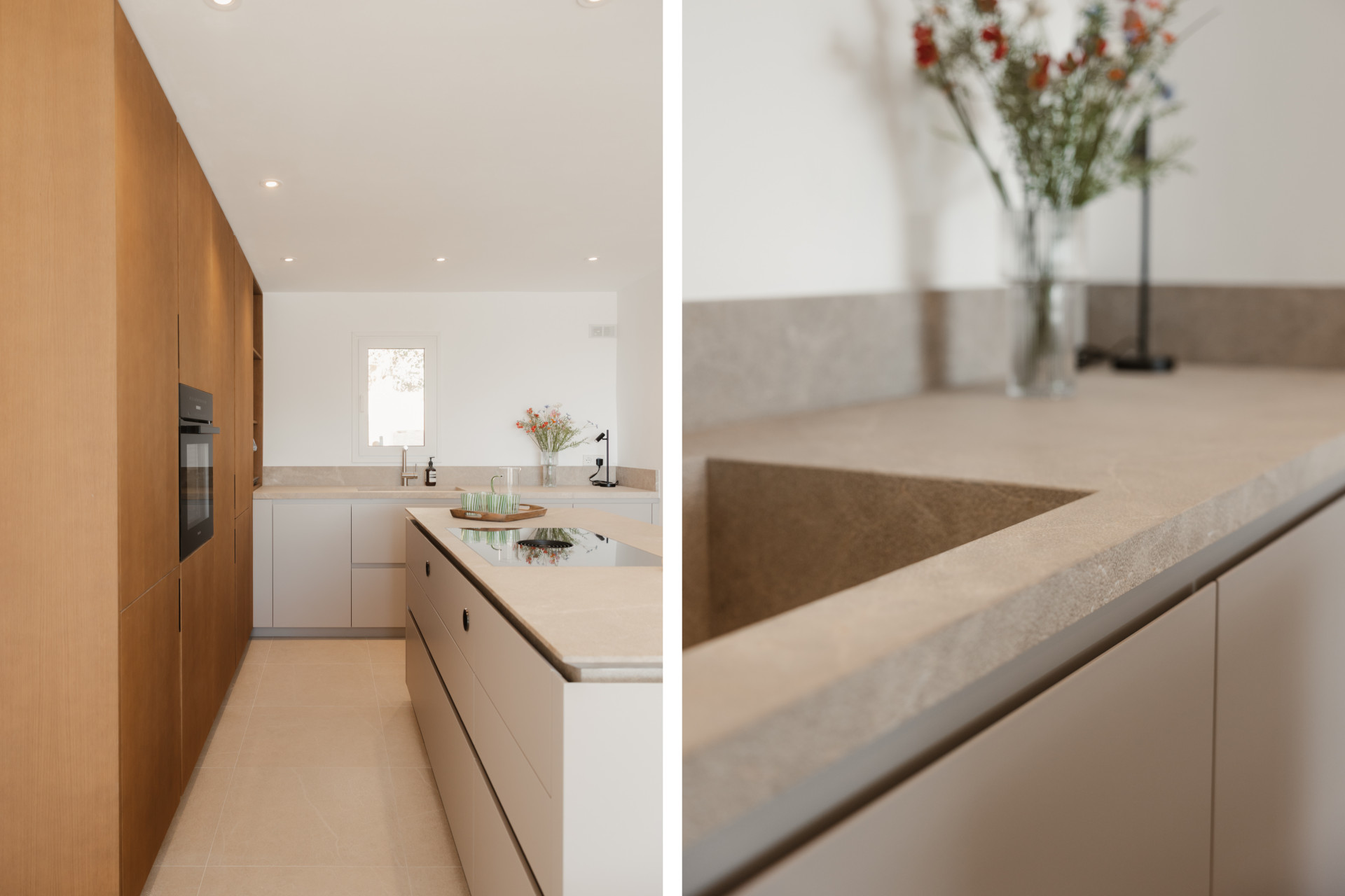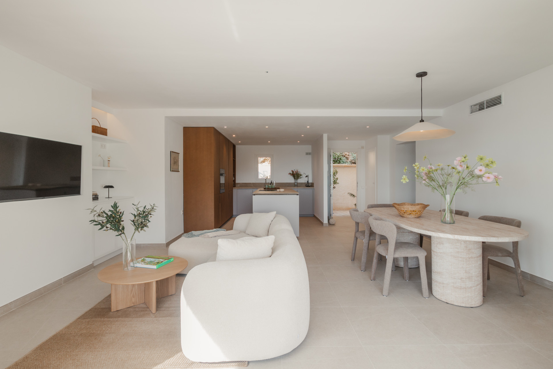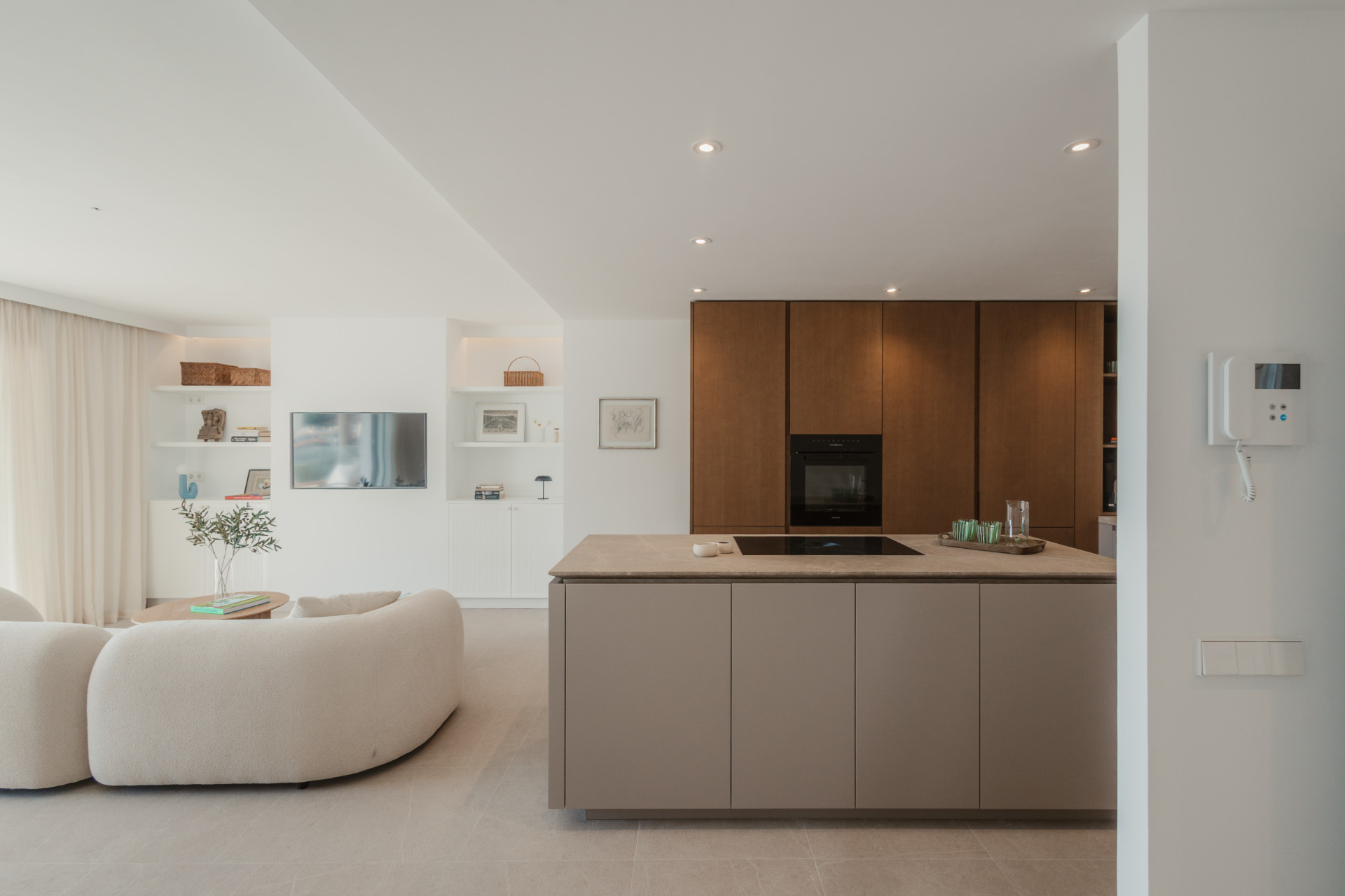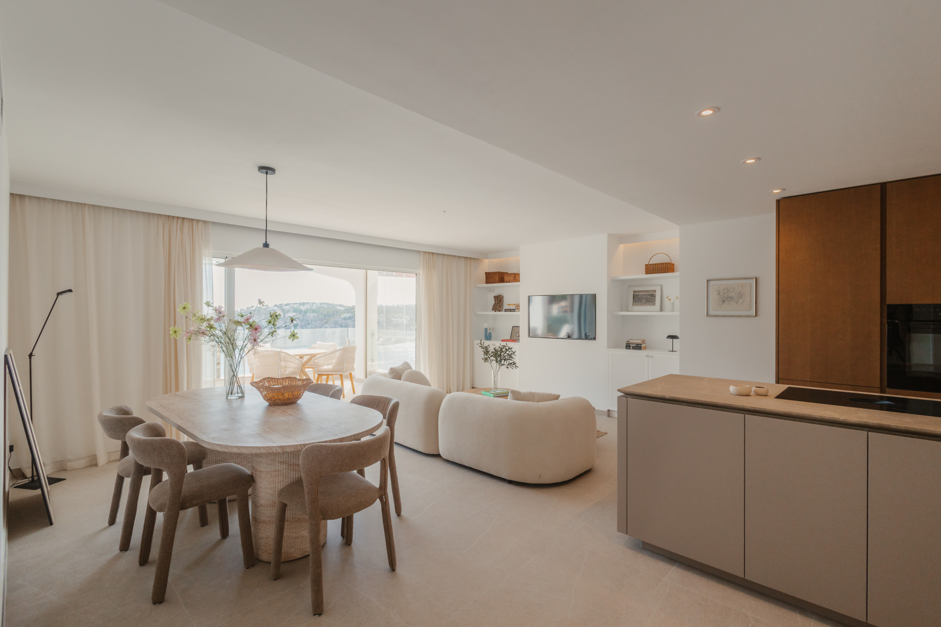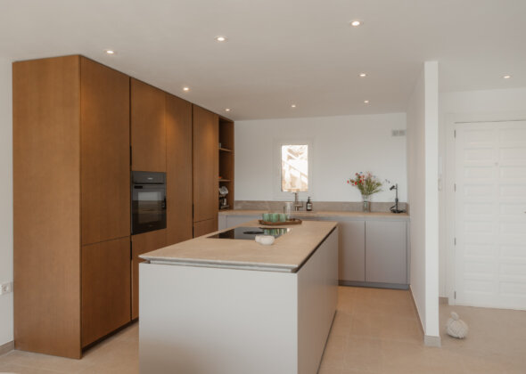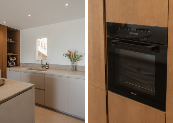 Upon entering, a stylish entrance hall leads you into an expansive open-plan living and dining area, designed for both comfort and contemporary living. Floor-to-ceiling windows fill the space with natural light, creating a warm and inviting ambiance throughout the day. The exclusive Espacio kitchen is a culinary masterpiece, equipped with a Bora cooktop and premium Miele appliances — perfectly uniting design, technology, and function for a truly refined cooking experience.