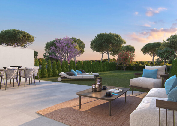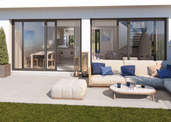 The complex consists of 32 spacious 4-bedroom townhouses with different interior layout options, modern design, open-plan living spaces with large terraces and solariums in some homes. Parking for two spaces on the surface. It is located on the golf course and the homes have dual N-S orientation. Landscaped common areas and a pool with a relaxation area, as well as parking for buggies.