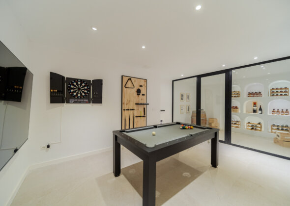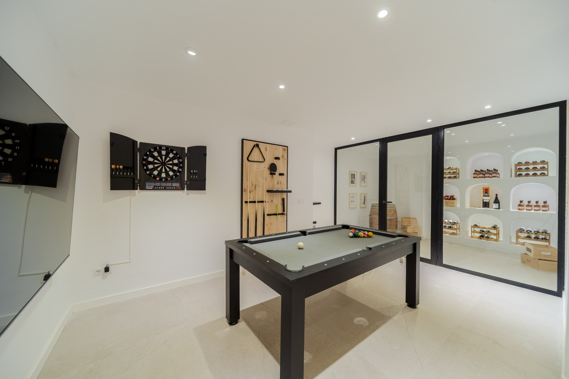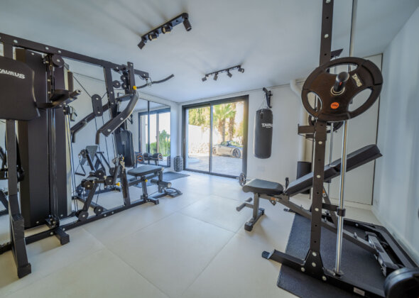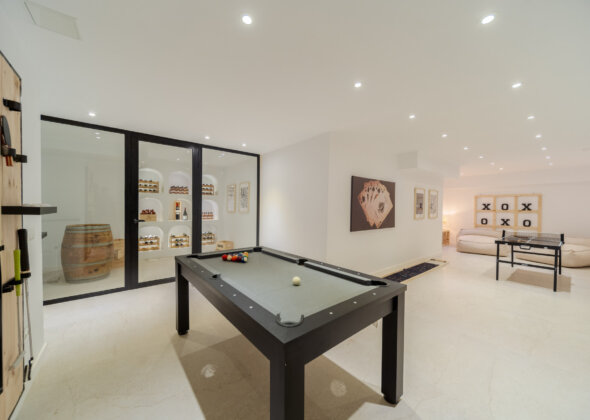 Wine enthusiasts will appreciate the well-equipped wine cellar, while fitness lovers can stay active in the fully equipped gym. The house also includes a convenient storage room and parking for up to 5 cars.