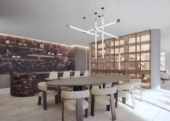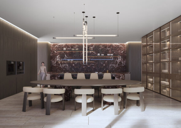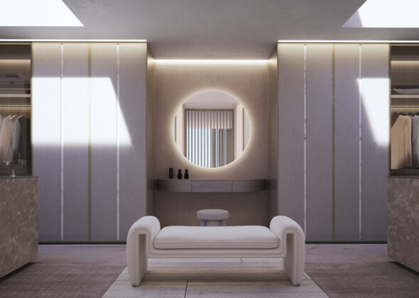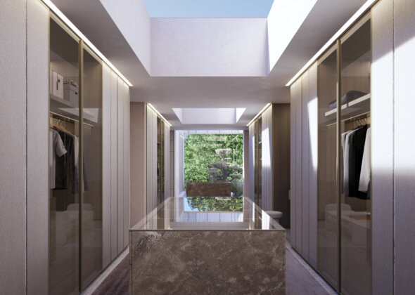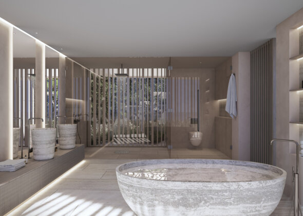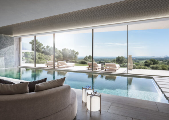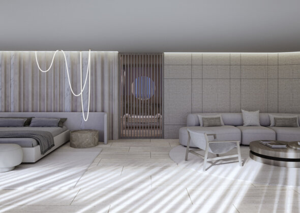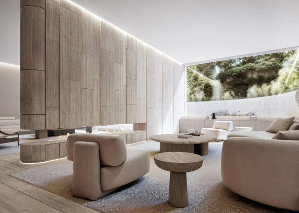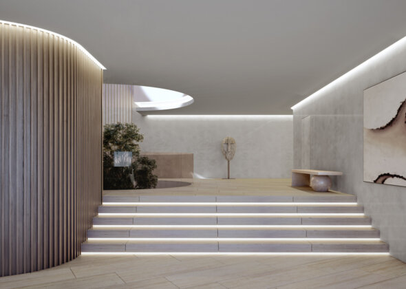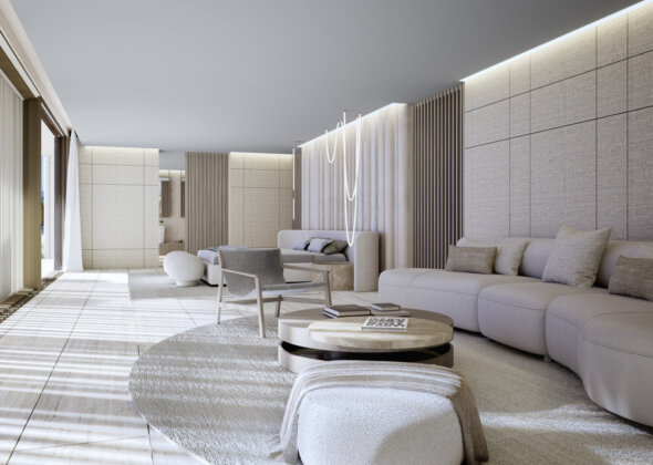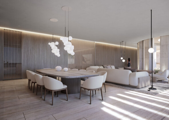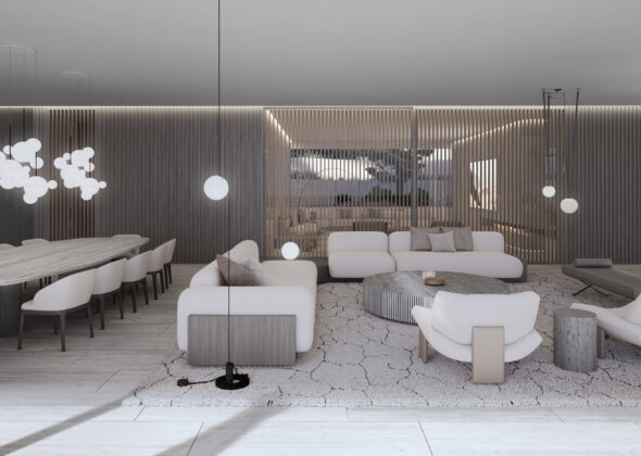 The design of the home emphasizes open, flowing spaces that seamlessly blend indoor and outdoor living. Expansive terraces, landscaped gardens, and floor-to-ceiling windows create a sense of continuity with the natural surroundings. The interiors are characterized by understated luxury, natural textures, and a neutral color palette that enhances the home’s connection to light and space.